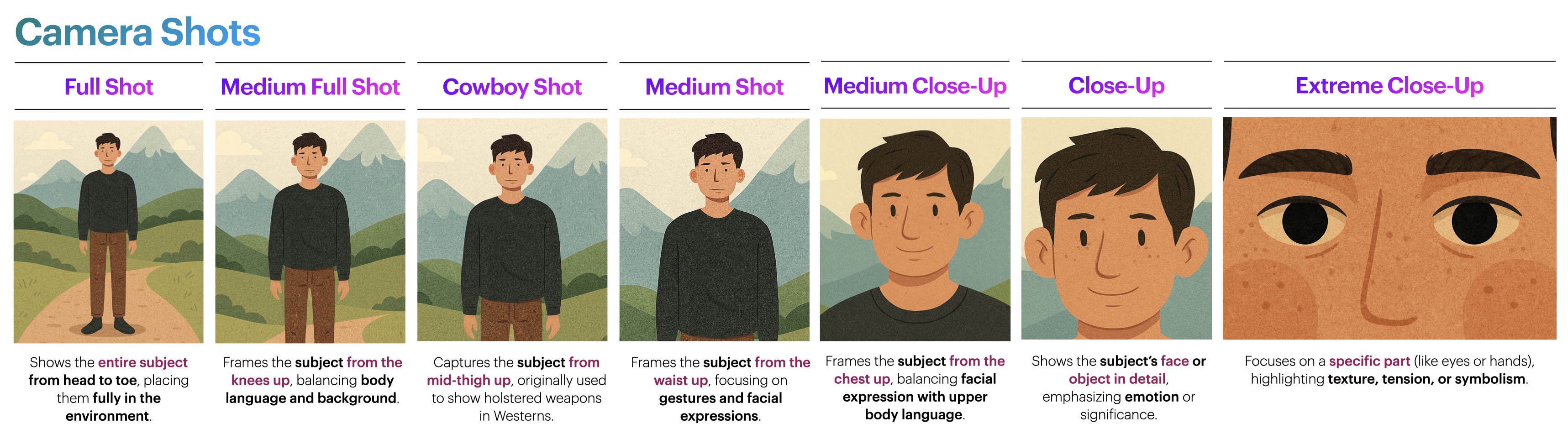 Camera Shots: Close-Up, Medium Shot, Full Shot, etc.