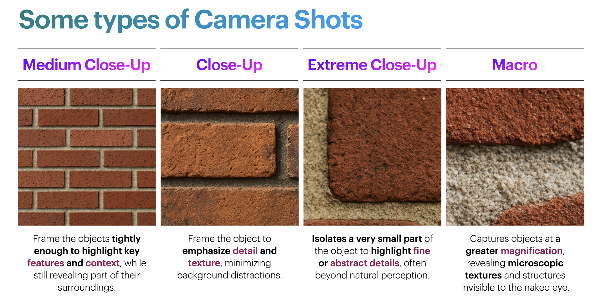How will we apply medium close-up, close-up, and extreme close-up photography techniques?