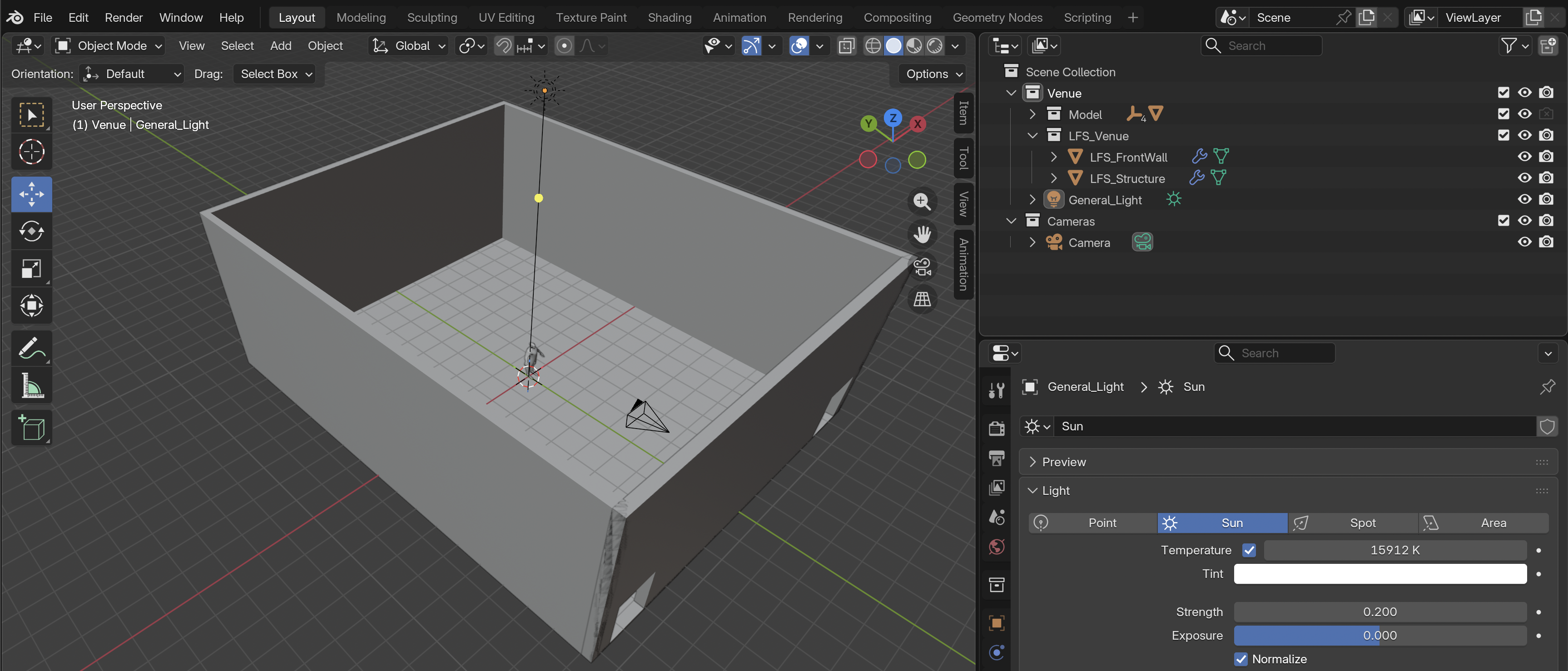 You will begin with this Blender file, which contains a collection named “Venue” with the following: