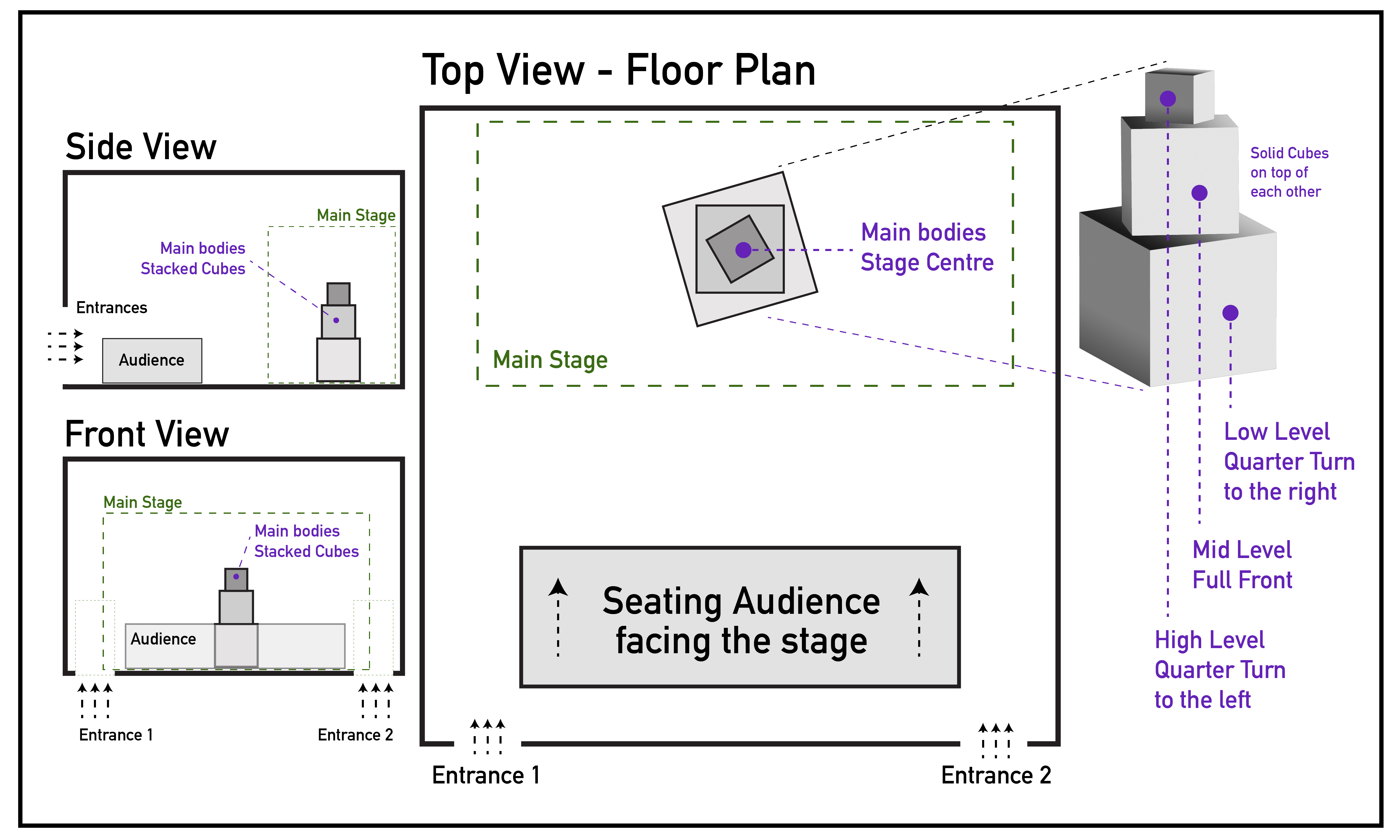 Using the black box setting (square, low ceiling) - check example above, design your scene and clearly indicate it in all required views: