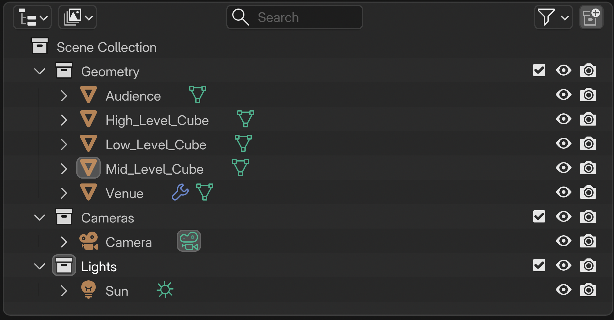 When working on your scene, you must organize it using three collections: