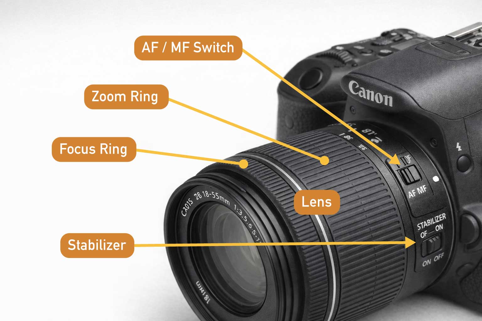 Controls focal length on zoom lenses (e.g., 18–55mm).