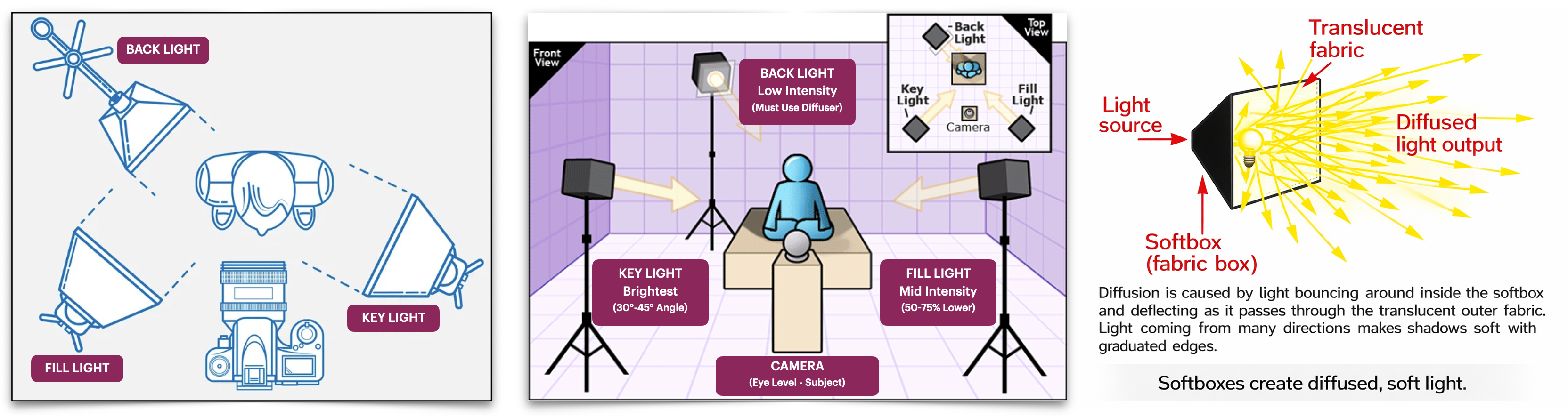 Set up a basic three-point lighting arrangement, adjusting key, fill, and back light to shape contrast