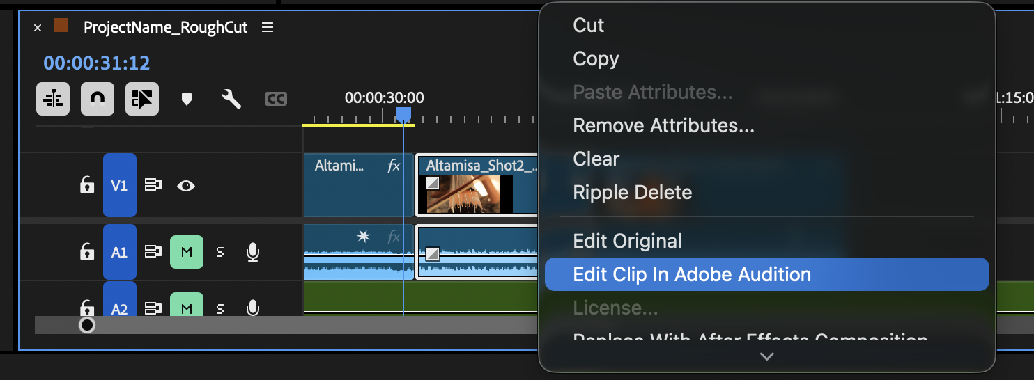 If you need to continue editing your audio later, you can reopen the Audition session file that was created during the Premiere → Audition workflow.