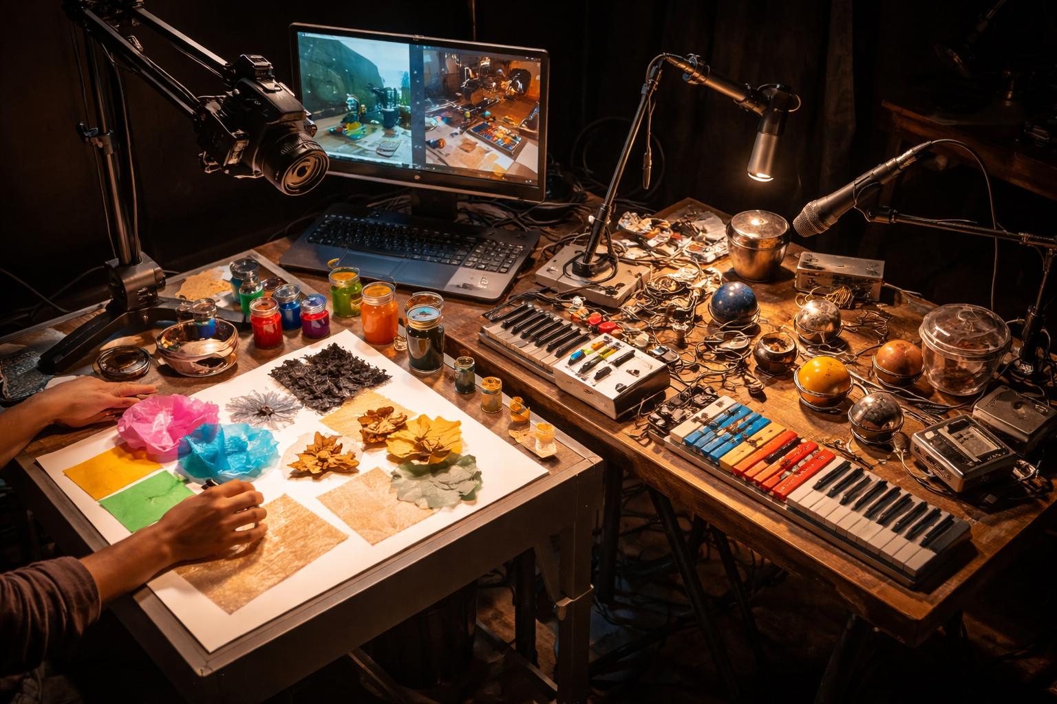 Visual storytelling must rely on improvisation, material exploration, and live manipulation.